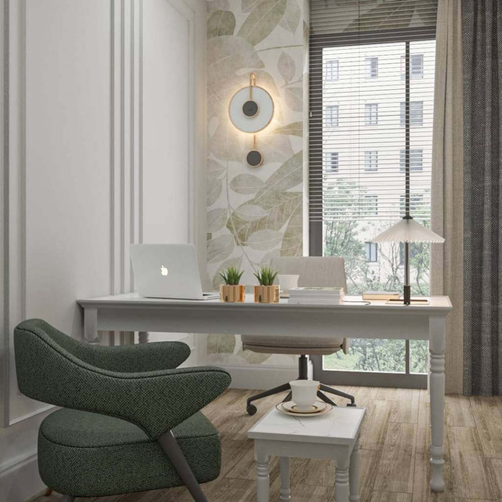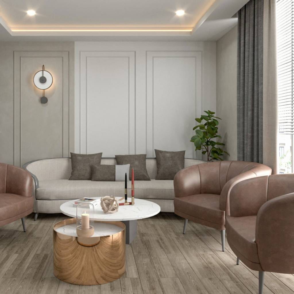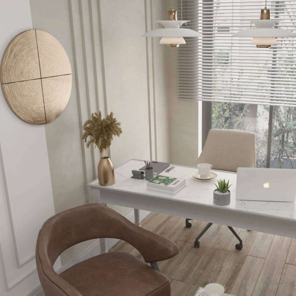 Ofis ve terapi odalarında, dikkati dağıtmayan minimalist bir mobilya düzeni tercih edilmiştir. Çalışma masalarındaki beyaz mermer dokusu ve pirinç gold ayak detayları, mekanın yumuşak lüks çizgisini destekler. Aydınlatma tasarımı, gözü yormayan katmanlı bir yapıda kurgulanmıştır; tavandaki tasarım sarkıtlar genel aydınlatmayı sağlarken, köşelerdeki lambaderler seanslar sırasında daha loş ve mahrem bir atmosfer oluşturulmasına olanak tanır.