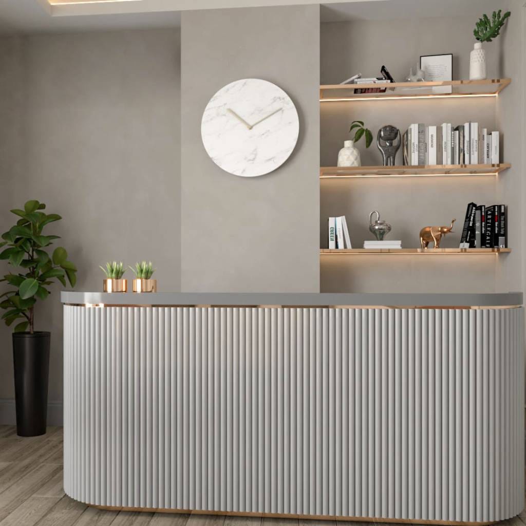 Giriş bölümü, akışkan formlu ve yivli detaylara sahip resepsiyon bankosu ile heykelsi bir duruş sergiler. Bekleme salonunda tercih edilen kavisli kanepe formları ve taba rengi deri berjerler, mekanın sert köşelerini yumuşatarak sosyal mesafeyi koruyan konforlu bir oturma düzeni sağlar. Duvar sanatları ve bitkisel öğeler, bekleme sürecindeki gerginliği minimize edecek görsel odaklar oluşturur.