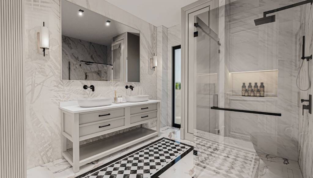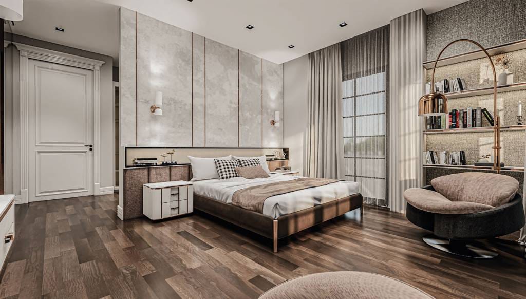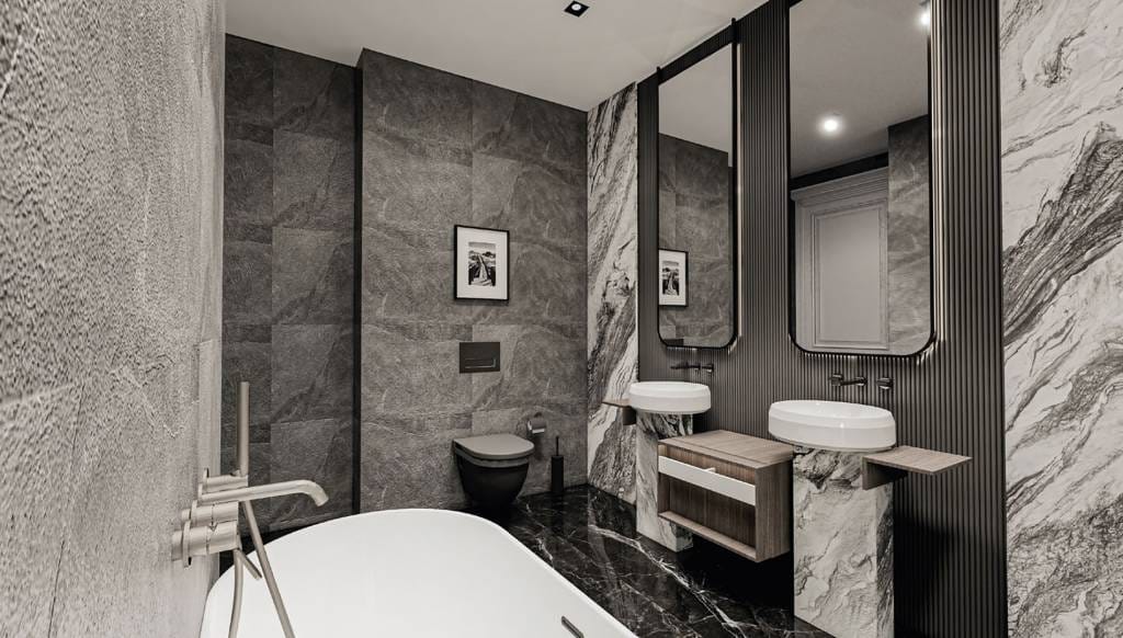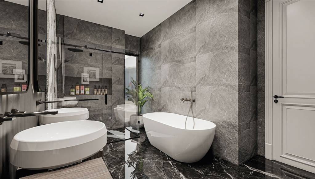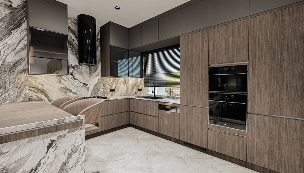 Mutfak tasarımında, genel alanın aksine koyu ceviz ahşap kaplamalar ve füme cam detaylar tercih edilerek daha maskülen ve net bir hat yakalanmıştır. Yatak odaları ve giyinme bölümlerinde (walk-in closet) ise cam, ayna ve yumuşak tekstil dokuları kullanılarak “boutique hotel” standartlarında bir konfor alanı yaratılmıştır. Islak hacimlerdeki gri doğal taş uygulamaları ve serbest duran küvetler, villanın genelindeki malzeme kalitesini sürdürür.