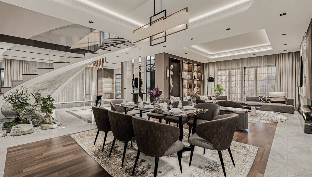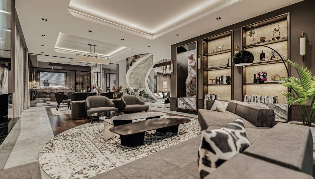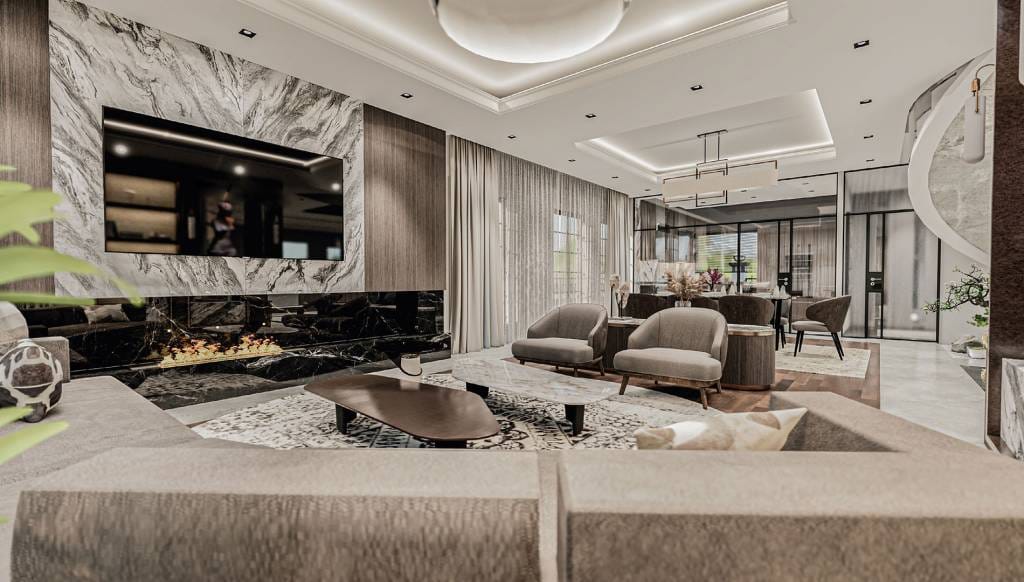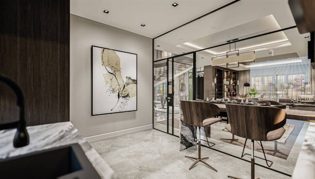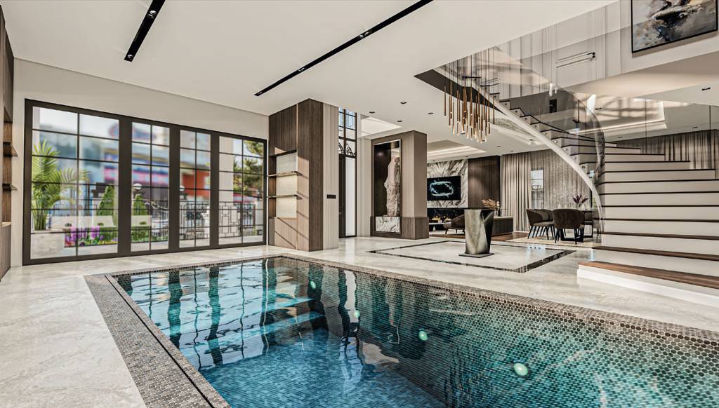 Zemin kat planlamasının en radikal ve çarpıcı kararı, indoor havuz izole bir spa alanı yerine, salon ve yemek bölümüyle iç içe kurgulanmasıdır. Yaşam alanının zeminindeki mermer dokusu, suyun yansımasıyla birleşerek mekana derinlik katar. Şömine duvarında kullanılan “bookmatch” mermer kaplama ve modern mobilya seçimleri, suyun yarattığı dingin atmosferi lüks bir salon estetiğiyle tamamlar.